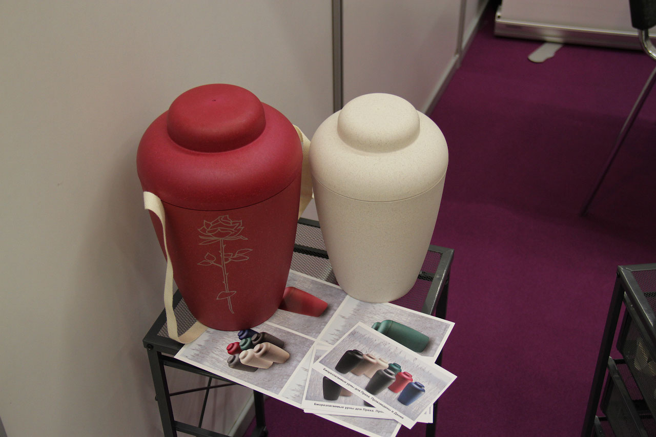 Помимо привычных ритуальных принадлежностей, на выставке можно было увидеть отражение современных тенденций в похоронной сфере: биоразлагаемые урны датского производства, стенд крионистов «КриоРус», самые современные гравировальные станки, новейшее кремационное оборудование из Венгрии, а также катафальный транспорт, оборудованный по последнему слову техники, и надгробия из стекла.