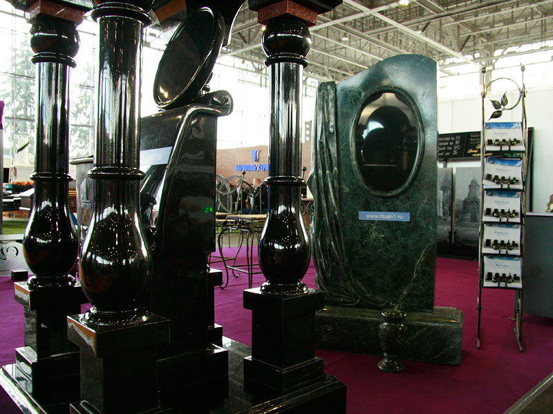Даже в таком, казалось бы, весьма консервативном секторе как могильные памятники, производители и поставщики надгробий представили нетривиальные решения. Так, на стенде компании ЗАО «Ритуал-1» можно было увидеть скульптуры из стекла. Благодаря отработанной технологии производства, стеклянные элементы надгробий не боятся температурных перепадов, прочны и долговечны. Кроме стеклянных скульптур, компания также предложила декоративные стеклянные ограждения, украшенные орнаментом, а также стеклянную мозаику. Все эти элементы могут быть выполнены как отдельно, так и в сочетании с природным камнем. Помимо наиболее востребованных гранитных надгробий, на стенде компании были представлены памятники из змеевика и диабаза, а также образцы, выполненные по китайской технологии: каменная основа, покрытая полимерной смолой.