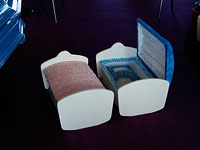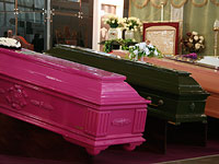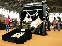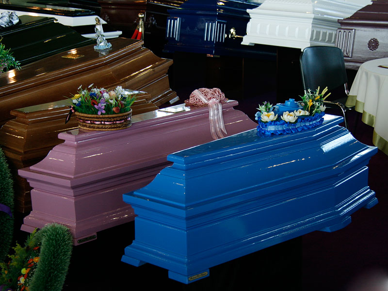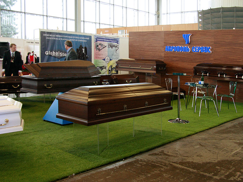 Ассортимент обширного стенда Новосибирского завода специальных изделий поразил разнообразием: по обеим сторонам главной аллеи выставочного зала были выставлены гробы самых разнообразных размеров и расцветок от ярко-розового до кофейно-бежевого.